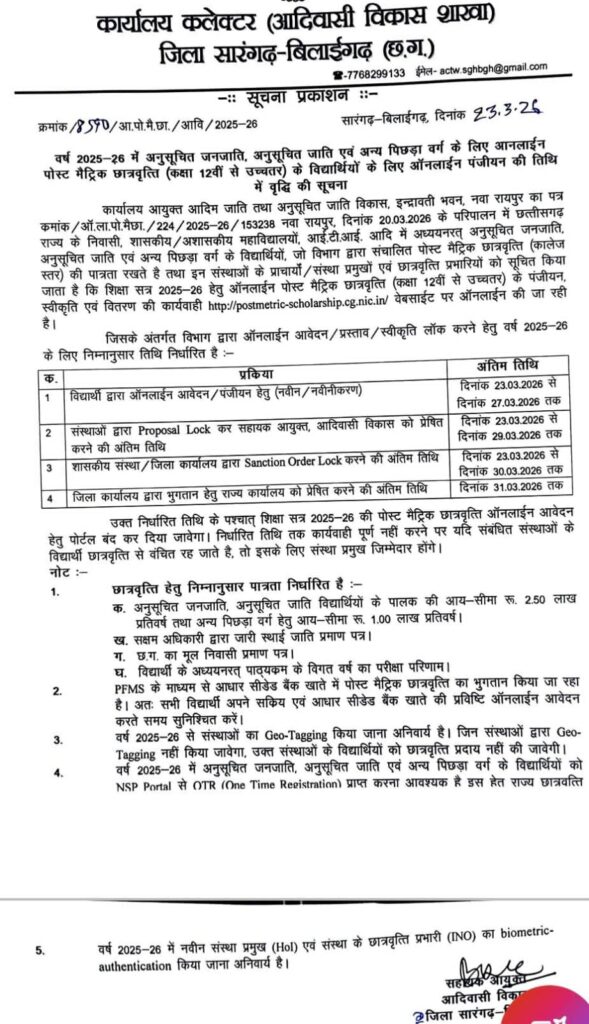 सारंगढ़ बिलाईगढ़, 23 मार्च 2026/आदिम जाति तथा अनुसूचित जाति विकास विभाग द्वारा अनुसूचित जाति, अनुसूचित जनजाति एवं अन्य पिछड़ा वर्ग के अध्ययनरत विद्यार्थियों को सूचित किया गया है कि, वे शिक्षा सत्र 2025-26 के पोस्ट मैट्रिक छात्रवृत्ति छात्रवृत्ति के लिए विभागीय पोर्टल पोस्ट मैट्रिक स्कॉलरशिप डॉट सीजी डॉट एनआईसी डॉट इन https://postmatric-scholarship.cg.nic.in में नवीनीकरण और नवीन आवेदन 27 मार्च 2026 तक जमा कर सकते हैं। निर्धारित तिथि के बाद शिक्षा सत्र 2025-26 के पोस्ट मैट्रिक छात्रवृत्ति छात्रवृत्ति के लिए विभागीय पोर्टल को बंद किया जाएगा।