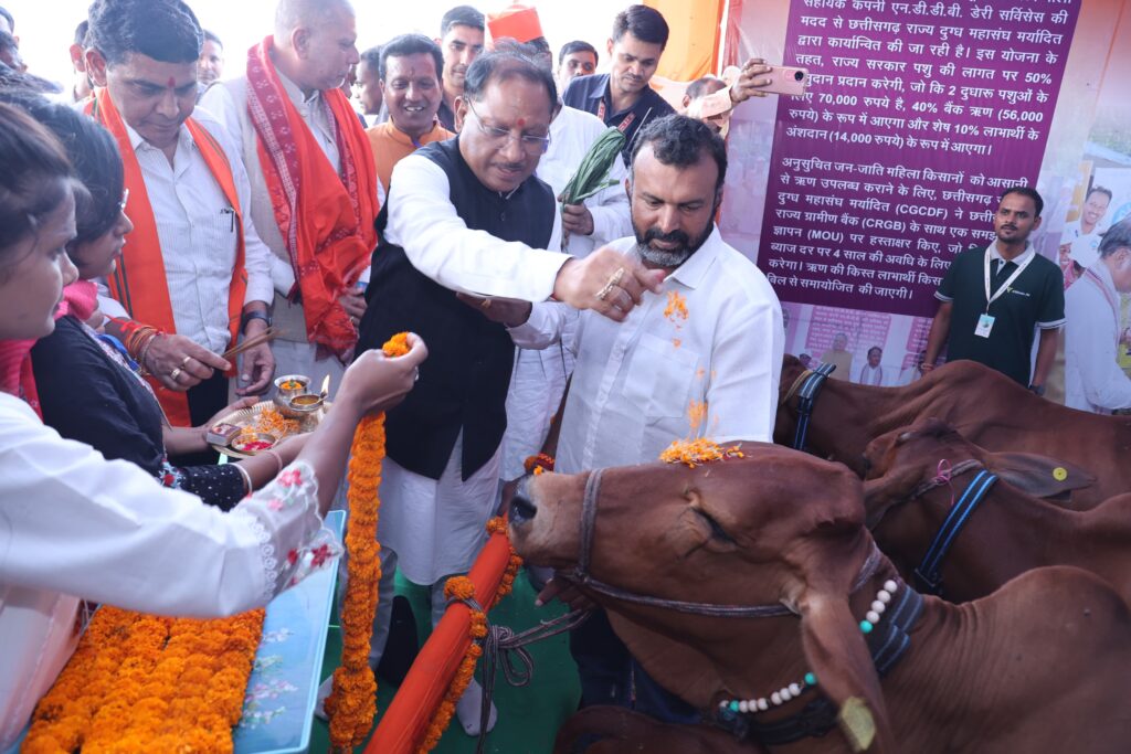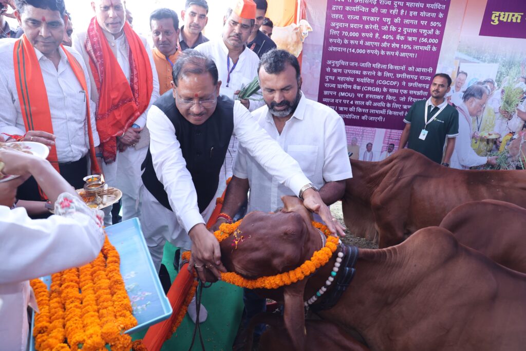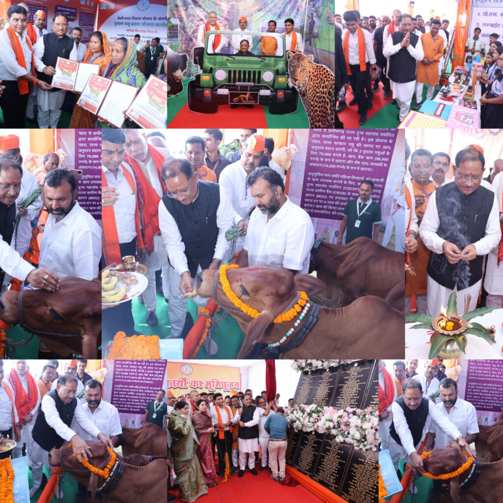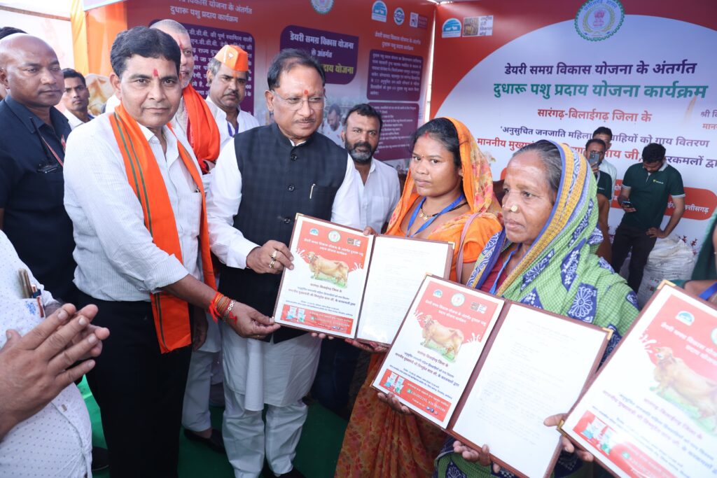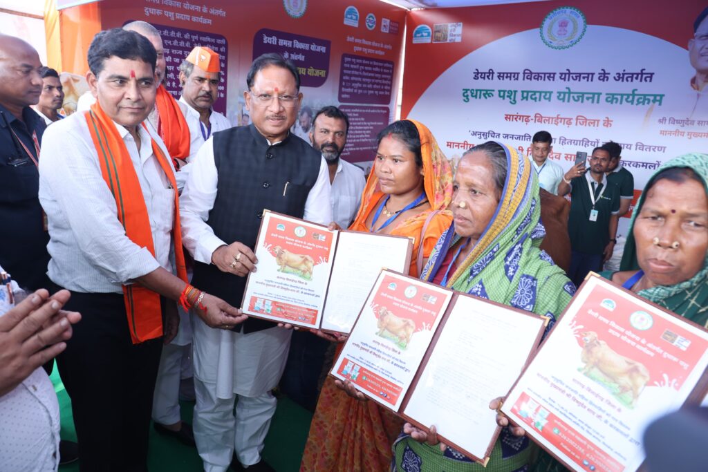 मुख्यमंत्री विष्णु देव साय ने शासकीय पंडित लोचन प्रसाद पाण्डेय कालेज सारंगढ़ के मैदान में आयोजित भूमिपूजन और लोकार्पण कार्यक्रम के पूर्व जिले के विभिन्न विभागों के स्टालों का निरीक्षण किया। पहला स्टॉल पशुधन विकास विभाग का था, जहां डेयरी समग्र विकास योजना के अंतर्गत दूधारू पशु प्रदाय योजना कार्यक्रम अंतर्गत अनिसूचित जनजातीय की महिला हितग्राहियों को