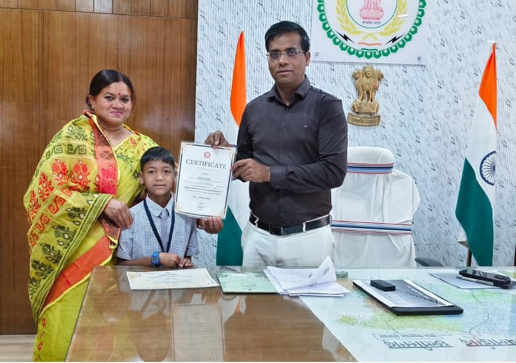 सारंगढ़ बिलाईगढ़, 9 मार्च 2026/कलेक्टर डॉ संजय कन्नौजे ने अपने कार्यालय में वर्ड पावर चैंपियनशिप छत्तीसगढ़ 2026 विजेता रोशन निषाद, शिक्षिका एवं कोच सुनीता यादव को प्रशस्ति पत्र देकर सम्मानित किया। इस अवसर पर रोशन निषाद की माता उत्तरा निषाद और पिता हीरालाल निषाद भी उपस्थित रहे। जिले के समग्र शिक्षा के सरकारी प्राथमिक स्कूल खिचरी का छात्र 530 बच्चों के साथ प्रतिस्पर्धा करते हुए वर्ड पावर चैंपियनशिप छत्तीसगढ़ 2026 का विजेता चुना गया। मात्र 9 साल का रोशन निषाद तीस बत्तीस अक्षर के अंग्रेजी शब्दों को निडरता के साथ फर्राटे से पढ़ लेता है। वह विगत वर्ष भी विजेता 2 रहा। इनकी शिक्षिका एवं कोच सुनीता यादव बच्चों को अंग्रेजी में दक्ष करने एक्स्ट्रा क्लास लेकर प्रतियोगिताओं के लिए तैयार करती है। विजेता छात्र रोशन निषाद ने जिला सारंगढ़ -बिलाईगढ़ का नाम रोशन किया है। समग्र शिक्षा खिचरी वर्ड पावर चैंपियनशिप का गढ़ माना जाता है। प्रत्येक वर्ष यहां के बच्चे विजेता और उपविजेता का ट्राफी अपने नाम करते हैं।