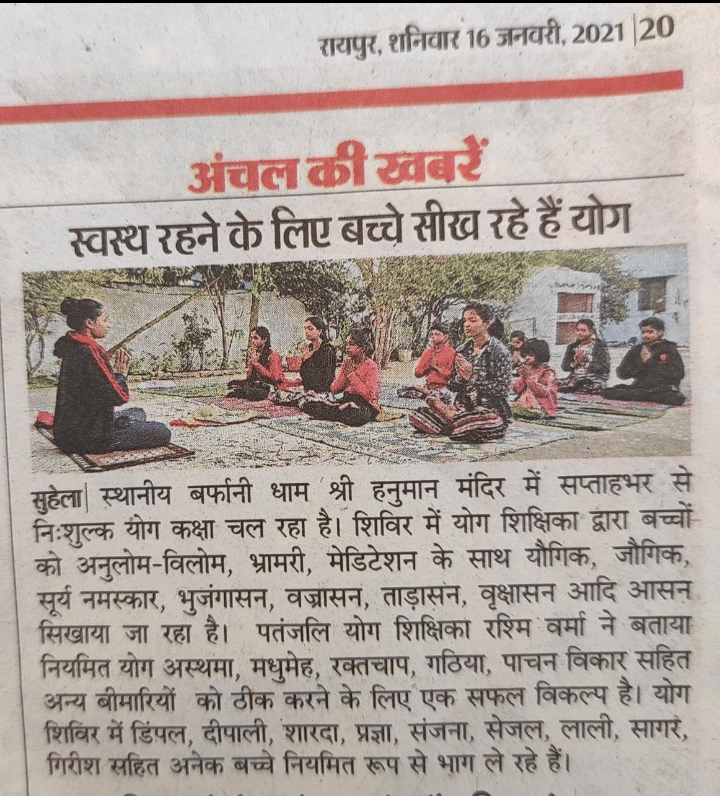 सुहे ला के स्थानीय बर्फानी धाम श्री हनुमान मंदिर में लगभग एक सप्ताह से योग शिक्षिका रश्मि वर्मा जी द्वारा बच्चों को निः शुल्क योगाभ्यास करा रही है।
