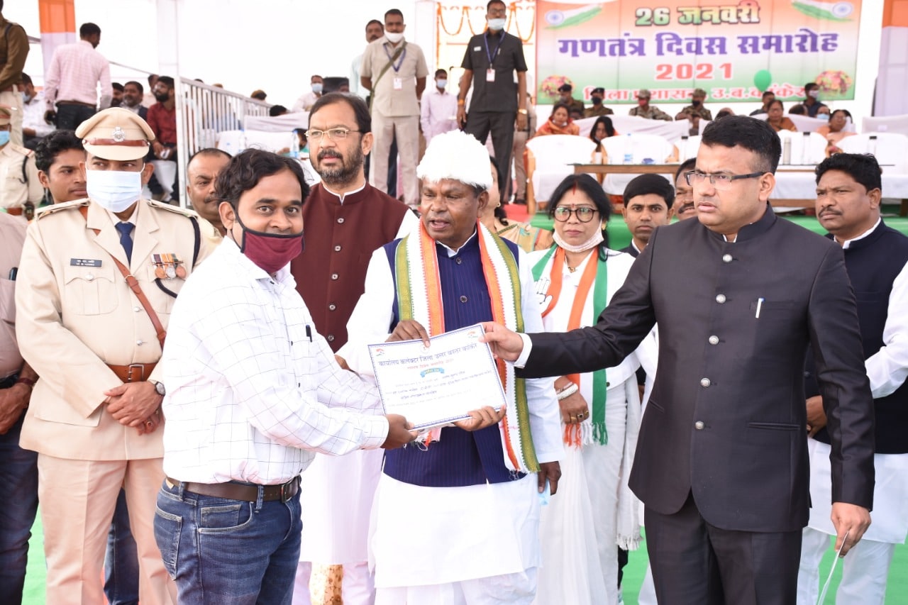 काँकेर – शासकीय इंदरु केंवट कन्या महाविद्यालय उत्तर बस्तर काँकेर, छत्तीसगढ़ के गृह विज्ञान विभाग के सहायक प्राध्यापक और कार्यक्रम अधिकारी राष्ट्रीय सेवा योजना प्रकोष्ठ प्रो. अजय कुमार पटेल को उनके सामुदायिक सेवा में उत्कृष्ट कार्य, सामाजिक जागरूकता एवं गतिशीलता, पोषण एवं स्वास्थ्य कार्यक्रमों में सक्रिय भूमिका व जिला प्रशासन के जनहित कार्य में समन्वय के साथ कोरोना संक्रमण से बचाव को लेकर व्यापक जनजागरूकता हेतु आज 72वें गणतंत्र दिवस पर मुख्य अतिथि कवासी लखमा कैबिनेट मंत्री आबकारी और उद्योग विभाग छत्तीसगढ़ शासन, राजेश तिवारी संसदीय सलाहकार मुख्यमंत्री, चंदन कुमार ज़िलाधीश काँकेर, एम.आर.आहिरे पुलिस अधीक्षक जिला उत्तर बस्तर काँकेर द्वारा प्रशस्ति पत्र से सम्मानित किया गया ।