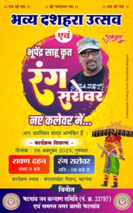 कार्यक्रम में आज भूपेंद्र साहू कृत रंग सरोवर धूम मचाएंगे. वहीँ रावण दहन शाम 6 बजे किया जायेगा एवं सांस्कृतिक कार्यक्रम रंग सरोवर रात्रि 9 बजे प्रारम्भ होगी.