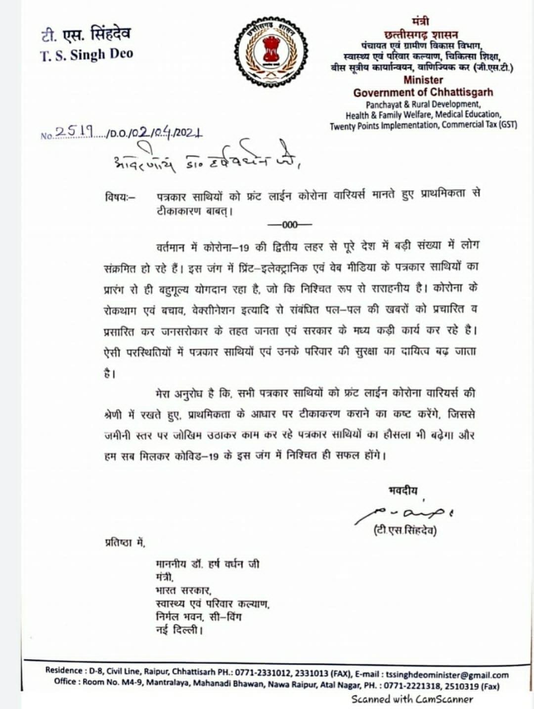 स्वास्थ्य मंत्री श्री टी एस सिंहदेव ने केंद्रीय स्वास्थ्य मंत्री श्री हर्षवर्धन को लिखा पत्र, पत्रकारों को फ्रंट लाइन वारियर्स के रूप में टीकाकरण का किया आग्रह