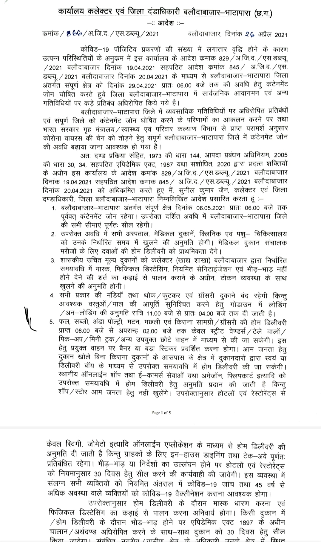 बलौदाबाजार :कलेक्टर ने जिले में 6 मई 2021 तक बढ़ाई लॉक डाउन क़ी अवधि, देखे आदेश…