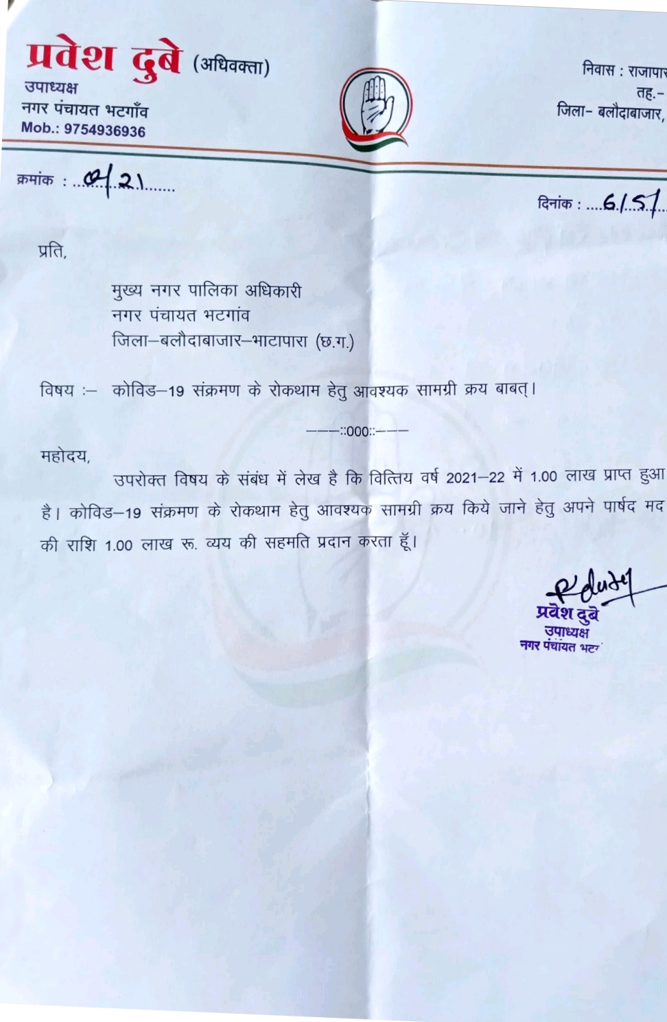 नगर पंचायत भटगांव में कोरोना के बढ़ते संक्रमण को देखते हुए नगर के अध्यक्ष, उपाध्यक्ष एवं पार्षदों ने नगर में कोविड -19 संक्रमण के रोकथाम के लिए आवश्यक सामग्री क्रय हेतु अपने निधि से कुल 11 लाख की स्वीकृति प्रदान किए हैं. जिसमे से नगर पंचायत अध्यक्ष श्रीमती नर्मदा कौशिक ने अपने निधि से 5 लाख 50 हजार रुपये , नगर पंचायत उपाध्यक्ष प्रवेश दुबे 1 लाख रुपये, एल्डर मैन सुधराम यादव ने 75 हजार, एल्डर मेन दिल हरण साहू ने 75 हजार, पार्षद सुकबाई नवरंग 1 लाख,पार्षद ईश्वर केवट ने 1 लाख एवं पार्षद डी के नवरंग ने 1 लाख स्वीकृति प्रदान किए हैं और लोगों को सन्देश दिए कि इस विषम परिस्थिति में अपने से जैसा बन पड़े एक दूसरे का सहयोग करते हुए, कोरोना फाइटर के रूप में कार्य कर रहे कर्मचारियों का भी सहयोग प्रदान कर अपने नगर, राज्य एवं देश को कोरोना मुक्त करना है.