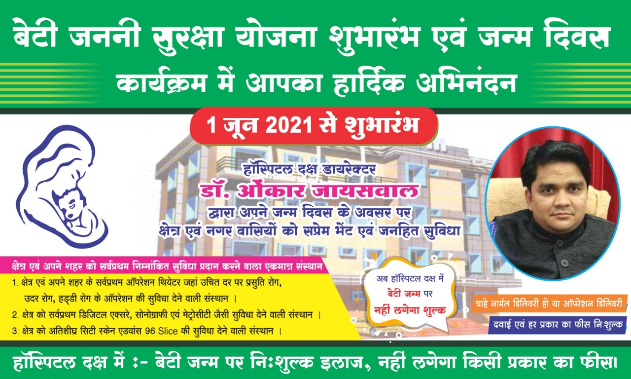 हॉस्पिटल दक्ष बिलाईगढ़ क्षेत्र के सर्व श्रेष्ठ ,सर्वसुविधा युक्क्त एक मात्र हॉस्पिटल है जहाँ मरीजों को ईलाज के लिए हर सुविधा प्रदान की जाती है, हॉस्पिटल दक्ष के डायरेक्टर ओंकार जायसवाल ने अपनी बर्थडे सेलिब्रेट कर बेटी जननी सुरक्षा योजना का शुभारंभ किया है, इस योजना के तहत प्रसूति महिलाओं के बेटी होने पर उनके दवा ईलाज डिलिवरी सहित सभी खर्च हॉस्पिटल दक्ष उठाएगी किसी भी प्रसूति महिलाओं ,माताओं को अपने बेटियों के जन्म पर खर्च नहीं करनी पड़ेगी,हॉस्पिटल के डायरेक्टर ने कहा कि सामाज में जन जागरूकता की कमी है जिनकी वजह से घर में बेटीयां होने पर अक्सर परिजनों के चेहरे में मायूसी देखने को मिलता है,बेटियों के प्रति सामाज के लोग अपनी विचारधारा बदल सके उस उद्देश्य से बेटी जननी सुरक्षा योजना की शुरुवात की है।