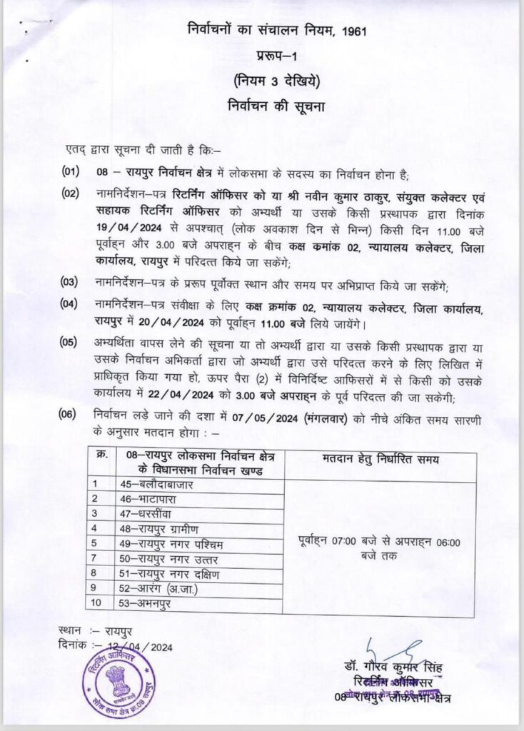 लोकसभा चुनाव के तीसरे चरण के लिए अधिसूचना जारी हो गई है। इसी के साथ तीसरे चरण के तहत छत्तीसगढ़ की सात सीटों रायपुर, दुर्ग, बिलासपुर, कोरबा, सरगुजा, जांजगीर चांपा और रायगढ़ लोकसभा सीट के लिए नामांकन की प्रक्रिया शुरू हो गई है। आज से तीसरे चरण के लिए प्रत्याशी अपना नामांकन पत्र सुबह 11 बजे से दोपहर 3 बजे तक दाखिल कर सकेंगे। तीसरे चरण के तहत नामांकन भरने की आखिरी तारीख 19 अप्रैल है. नामांकन पत्रों की जांच 20 अप्रैल को होगी. नाम वापसी की तिथि 22 अप्रैल है।