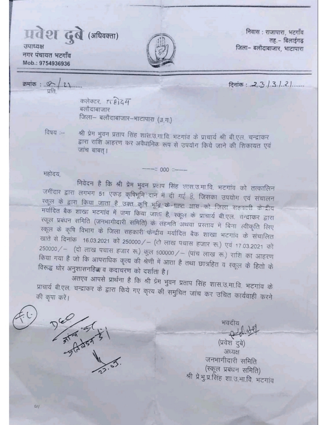 बलौदाबाजार – भटगांव के प्रेम भुवन प्रताप सिंह शासकीय उच्चतर माध्यमिक विद्यालय के प्राचार्य बीएल चंद्राकर द्वारा बिना जनभागीदारी की समिति की बैठक लिए एवं बिना किसी प्रस्ताव के नियम विरुद्ध स्कूल की राशि की 5 लाख रूपए का आहरण कर गबन करने के आरोप लगे हैं । मामले का खुलासा होने के पश्चात नगर पंचायत के उपाध्यक्ष एवं जनभागीदारी समिति के अध्यक्ष प्रवेश दुबे ने मामले की शिकायत कलेक्टर एवं जिला शिक्षा अधिकारी से की। जिस पर जिला शिक्षा अधिकारी सीएल ध्रुव ने नोटिस जारी करते हुए बीएल चंद्राकर द्वारा अवैधानिक रूप से राशि आहरण कर उपयोग किए जाने की शिकायत पर जांच कर उचित कार्यवाही करने का निर्देश दिया। प्राप्त शिकायत के अनुसार प्रेम भुवन प्रताप सिंह शासकीय उच्चतर माध्यमिक विद्यालय भटगांव को तत्कालीन जमीदार द्वारा तकरीबन 51 एकड़ कृषि भूमि स्कूल के संचालन एवं उपयोग हेतु दान में दी गई थी । उक्त कृषि भूमि से प्राप्त आय को जिला सहकारी केंद्रीय बैंक मर्यादित शाखा भटगांव में जमा किया जाता है। स्कूल के प्राचार्य बीएल चंद्राकर द्वारा स्कूल प्रबंधन समिति जनभागीदारी के सहमति अथवा प्रस्ताव के बिना स्वीकृति लिए खाते से दिनांक 16 मार्च 2021 को ढाई लाख रुपए एवं 17 मार्च 2021 को ढाई लाख रुपए आहरण कर लिया । जो कि अपराधिक श्रेणी का कृत्य है। एवं छात्र हित व स्कूल हितों के विरुद्ध घोर अनुशासनहीनता व कदाचरण किया गया। इस आशय की शिकायत प्राप्त होने के बाद कलेक्टर द्वारा समय सीमा पत्र के रूप में चयन कर अंकित करते हुए जांच कर प्रतिवेदन प्रस्तुत करने के निर्देश दिए गए।