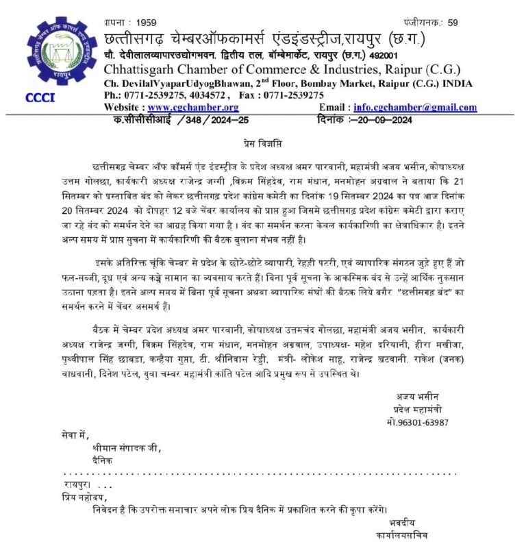 चेम्बर ऑफ कॉमर्स एंड इंडस्ट्रीज के प्रदेश अध्यक्ष अमर पारवानी, महामंत्री अजय भसीन, कोषाध्यक्ष उत्तम गोलछा, कार्यकारी अध्यक्ष राजेन्द्र जग्गी, विक्रम सिंहदेव, राम मंधान, मनमोहन अग्रवाल ने बताया कि 21 सितम्बर को प्रस्तावित बंद को लेकर छत्तीसगढ़ प्रदेश कांग्रेस कमेटी का 19 सितम्बर 2024 का पत्र आज दिनांक 20 सितम्बर 2024 को दोपहर 12 बजे चेंबर कार्यालय को प्राप्त हुआ जिसमे छत्तीसगढ़ प्रदेश कांग्रेस कमेटी द्वारा कराए जा रहे बंद को समर्थन देने का आग्रह किया गया है। बंद का समर्थन करना केवल कार्यकारिणी का क्षेत्राधिकार है। इतने अल्प समय में प्राप्त सुचना में कार्यकारिणी की बैठक बुलाना संभव नहीं है।