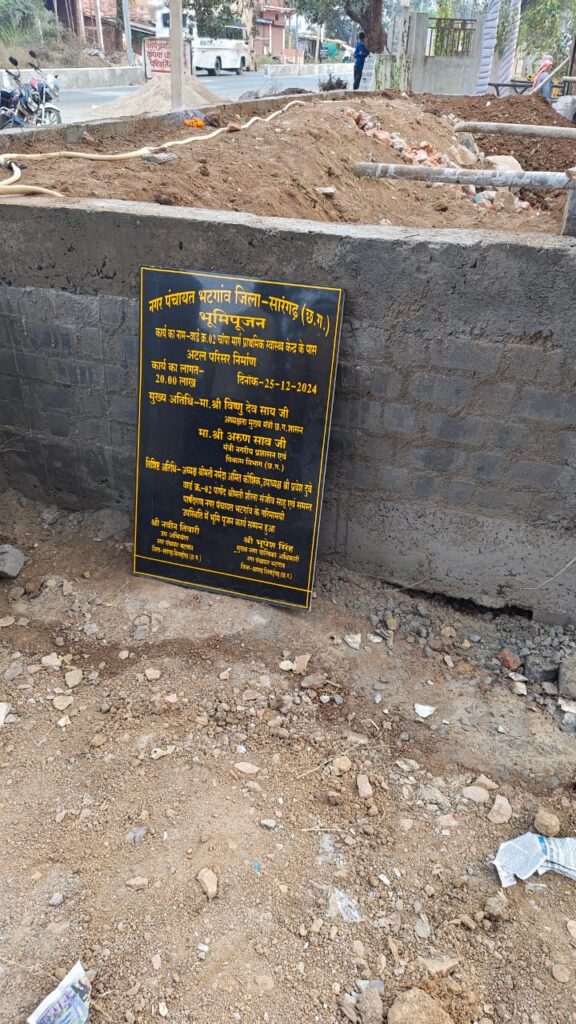 इसी तारतम्य में नगर क्षेत्र के गणमान्य नागरिको की गरिमामय उपस्थिति में अटल परिसर का भूमिपूजन सौहार्दपूर्ण वातावरण में किया गया था। वह कार्य सीएमओ श्री भूपेश सिंह के देखरेख पर अटल परिसर का निर्माण पूरे गुणवत्ता के साथ किया जा रहा है, जो कार्य समय सीमा से पूर्व ही पूरा कर ली जाएगी। ऐसी संभावनाएं व्यक्त की जा रही है। अटल परिसर का निर्माण 20 लाख में हो रहा है।