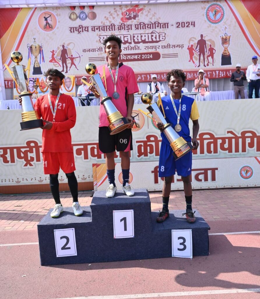फुटबॉल के 22 मैच, 122 गोल, 9 मैचों का परिणाम टाई ब्रेकर या पेनाल्टी शूट से रू 24 वीं राष्ट्रीय वनवासी क्रीड़ा प्रतियोगिता में फुटबॉल के जनजातीय खिलाड़ियों ने अपना खूब जौहर दिखाया। पूरी प्रतियोगिता में फुटबॉल के 22 मैच कोटा स्टेडियम और यूनिवर्सिटी खेल मैदान पर खेले गये। जनजातीय खिलाड़ियों ने इन मैचों में 122 गोल दागकर अपनी खेल प्रतिभा का प्रदर्शन किया। खेल के प्रति खिलाड़ियों का समर्पण और उनकी कुशलता इसी से सिद्ध होती है कि पूरी प्रतियोगिता में 9 मैचों का परिणाम टाई ब्रेकर या पेनाल्टी शूट से हुआ। फुटबॉल के खिलाड़ियों ने एक से बढ़कर एक प्रतिभावों का प्रदर्शन किया। अंत में संथाल परगना ने चौंपियन्स ट्रॉफी जीती और केरल उपविजेता रहा। संथाल परगना के गोलकीपर विनय कुण्डू ने फाइनल मैच में पेनाल्टी शूट के 4 गोल बचाकर सर्वश्रेष्ठ गोलकीपर का मेडल प्राप्त किया वहीं संथाल परगना के ही खिलाड़ी विमल मराण्डी मेन ऑफ द टूर्नामेंट रहें। फाइनल मैच में केरल के खिलाड़ी अभिनंद को मेन ऑफ द मैच घोषित किया गया।