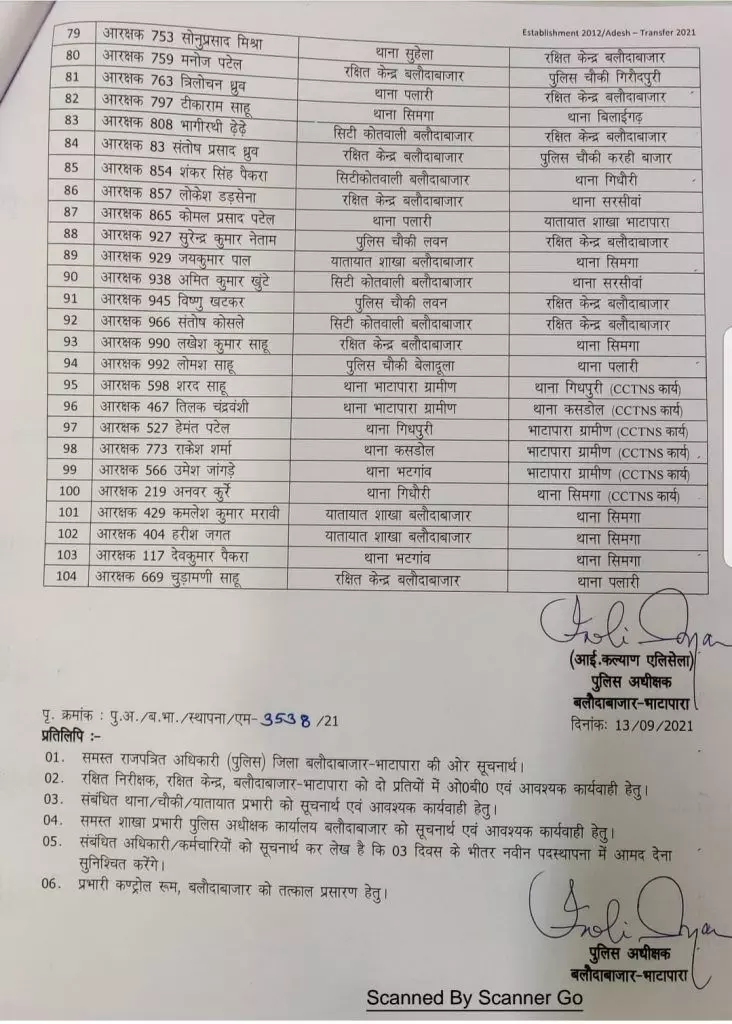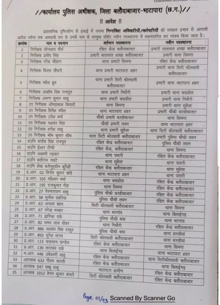 बलौदाबाजार निरीक्षक, उप निरीक्षक, सहायक उप निरीक्षक, प्रधान आरक्षक और आरक्षक समेत 104 पुलिसकर्मियों का थोक मे ट्रांसफर,देखें लिस्ट..
