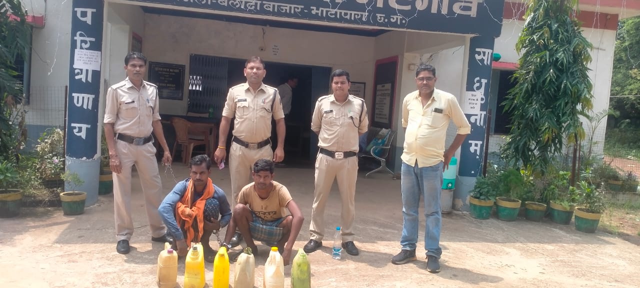 पुलिस अधीक्षक महोदय बलौदाबाजार श्री आई.के. एलिसेला द्वारा अवैध शराब, जुआ, सट्टा के विरुद्ध सख्त कानूनी कार्यवाही करने हेतु कड़े निर्देश दिए है जिस पर अमल करते हुए अतिरिक्त पुलिस अधीक्षक बलौदाबाजार श्री पिताम्बर पटेल एवं श्री संजय तिवारी अनुविभागीय अधिकारी पुलिस बिलाईगढ़ के मार्गदर्शन पर उपनिरीक्षक पुरषोत्तम कुर्रे थाना प्रभारी भटगांव के नेतृत्व मे थाना भटगांव पुलिस को दिनांक 04.09.2021 को देहात भ्रमण पर गोंदली का जितेन्द्र यादव एवं सोनसाय सिदार अपने कब्जे मे मोटर सायकल से महुआ शराब रखकर परिवहन करते घुटीकोना से दर्रा के रास्ते गोंदली जाने वाले है सूचना पर नाकाबंदी करने पर एक मोटर सायकल मे दो सवार व्यक्ति 01. सोनसाय सिदार पिता मंगलु सिदार साकिन कौहा थाना सलिहा हाल साकिन गोंदली थाना बिलाईगढ 02. जितेन्द्र पिता अकादशिया यादव साकिन गोंदली थाना बिलाईगढ को मोटर सायकल क्रमांक CG04DW4330 मे महुआ शराब रख कर परिवहन करने पर आरोपीगण 1. जितेन्द्र पिता अकादशिया यादव उम्र 34 साल साकिन गोंदली थाना बिलाईगढ जिला बलौदाबाजार 2. सोनसाय पिता मंगलु सिदार उम्र 36 साल साकिन कौहा थाना सलिहा हाल गोंदली थाना बिलाईगढ जिला बलौदाबाजार के संयुक्त कब्जे से 1. एक मोटर सायकल स्पेलेण्डर क्रमांक CG04DW4330 पुरानी इस्तेमाली किमती 20,000 रूपये 2. एक सफेद बोरी के अंदर मे 06 जरिकेन प्रत्येक जरिकेन मे 05-05 लीटर भरी हाथ भटठी का महुआ शराब कुल 30 लीटर हाथ भटठी कच्ची महुआ शराब करीबन किमती 3000 रूपये को मुताबिक जप्ती पत्रक के जप्त किया आरोपीगण का कृत्य अपराध धारा 34(2) आबकारी एक्ट का घटित करना पाये जाने से विधिवत गिरफ्तार कर आरोपियों के विरूद्ध अपराध क्रमांक 140/2021 पंजीबद्ध कर आरोपियों को गिरफ्तार कर न्यायिक रिमांड पर भेजा गया है।
