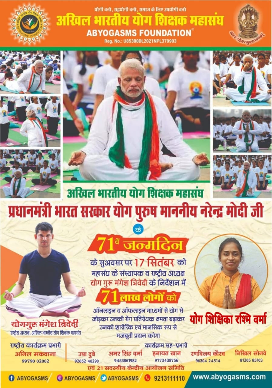 मा.प्रधानमंत्री जी के 71 वें जन्मदिन के सुअवसर पर अखिल भारतीय योग शिक्षक महासंघ द्वारा आयोजित 71 लाख सामूहिक योगा कार्यक्रम के संरक्षक बने आदरणीय केंद्रीय गृह राज्य मंत्री अजय कुमार मिश्रा जी:- मोनिका शर्मा