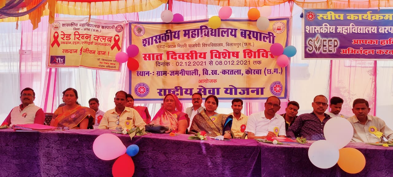 डॉ समरेंद्र सिंह राज्य संपर्क अधिकारी, मनोज सिन्हा कार्यक्रम समन्वयक अटल बिहारी वाजपेयी विश्वविद्यालय बिलासपुर, प्रो वाय के तिवारी जिला संगठक के मार्गदर्शन एवं डॉ अम्बिका प्रसाद वर्मा प्राचार्य के संरक्षण में कार्यक्रम अधिकारी द्वय डॉ रंजना नाथ एवं डॉ शिवदयाल पटेल के नेतृत्व एवं प्रो नंदिनी साहू, प्रो कोमलेश वैष्णव के सहनेतृत्व में राष्ट्रीय सेवा योजना के स्वयंसेवकों ने विद्यालय परिसर के खरपतवार को नष्ट कर स्वच्छ मैदान का निर्माण किया, गलियों की सफाई की, तालाब एवं पचरी के परिसर की सफाई के साथ ही ग्राम पंचायत के सहयोग से ग्राम में विद्यालय के सामने पक्का कूड़ादान का निर्माण किया। इस शिबिर के उद्घाटन अवसर के मुख़्यअतिथि श्रीमती गोदावरी प्रमोद राठौर जिला पंचायत सदस्य कोरबा एवं अध्यक्षता श्री परसराम कंवर सरपंच ने किया था।
