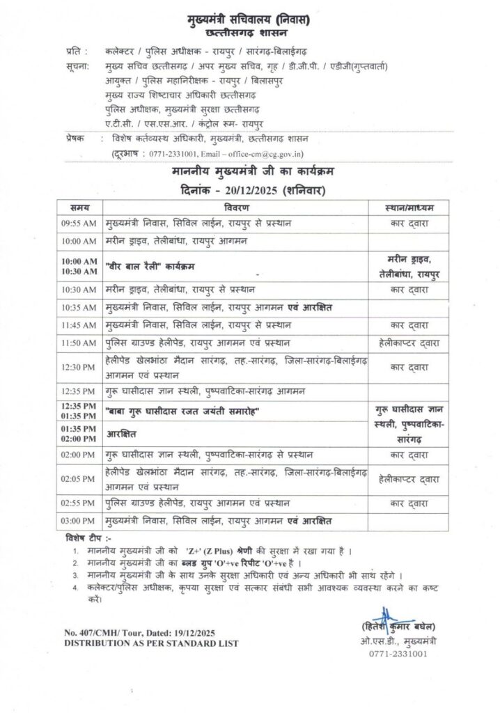 सारंगढ़-बिलाईगढ़, 19 दिसंबर 2025/ मुख्यमंत्री विष्णुदेव साय का शनिवार 20 दिसंबर को दोपहर 12.30 बजे हेलीकाप्टर से सारंगढ़ आगमन होगा। वे पुष्प वाटिका में आयोजित गुरु घासीदास रजत जयंती समारोह में शामिल होंगे। मुख्यमंत्री साय दोपहर 2.5 बजे हेलीकाप्टर से रायपुर के लिए प्रस्थान करेंगे।