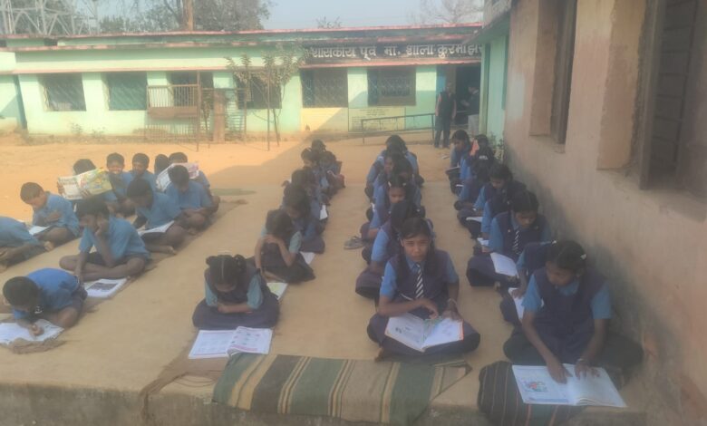 बिलाईगढ़ । बिलाईगढ़ विधानसभा के अंतर्गत वनांचल के ग्राम कुरमाझर में शाला भवन जर्जर होने के कारण छात्र-छात्राए खुले मैदान में पढ़ने को मजबूर हैं।