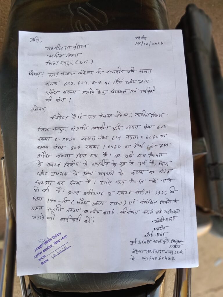 तिल्दा नेवरा :- तिल्दा (नेवरा) जनपद पंचायत से लगी ग्राम पंचायत बहेसर की शासकीय जमीन पर शौर्य प्लांट का अवैध कब्जा का आरोप लगाते हुए पूर्व भाजयुमो अध्यक्ष बंशी यादव ने तहसीलदार को आवेदन दिया . त ग्राम पंचायत बहेसर की मूल्यवान शासकीय भूमि खसरा क्रमांक 623, 624, 607 पर शौर्य प्लांट बहेसर द्वारा अवैध कब्जा करने का गंभीर आरोप लगा है। स्थानीय भाजपा युवा मोर्चा (भाजयुमो) के पूर्व अध्यक्ष बंशी यादव ने तहसीलदार को औपचारिक आवेदन देकर पैमाइश, बेदखली और सख्त कार्रवाई की मांग की है। ग्रामीण क्षेत्र में यह मामला गरमा गया है, क्योंकि शासकीय जमीन पर प्लांट संचालकों द्वारा कब्जा ग्रामीण विकास को प्रभावित कर रहा है।