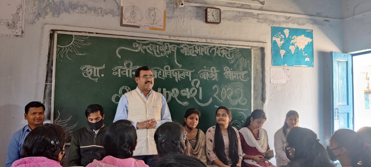 बाकी मोगरा : शासकीय नवीन महाविद्यालय बाकी मोंगरा में 21 फरवरी को अंतर्राष्ट्रीय मातृभाषा दिवस का आयोजन किया गया। प्राचार्य डॉ पुष्पराज लाजरस के संरक्षण एवं मार्गदर्शन में आयोजित इस कार्यक्रम के मुख्य वक्ता हिंदी विभाग के अध्यक्ष एवं प्रभारी प्राचार्य डॉ शिवदयाल पटेल ने कहा कि मातृभाषा दिवस का आयोजन अंतरराष्ट्रीय स्तर पर अपनी-अपनी मातृभाषा को महत्व सम्मान देने के लिए किया जाता है। उन्होंने प्राथमिक शिक्षा मातृभाषा में दिए जाने पर जोर देते हुए कहा कि मातृभाषा के कारण ही बच्चे में भावनाएं और उस भाषा से जुड़ी हुई चीज़ों का मतलब समझने का गुण धीरे-धीरे उत्पन्न होता है। इससे बच्चे के दिमाग़ में शब्दों और उनसे जुड़ी हुई चीज़ों का जुड़ाव विकसित होना शुरू हो जाता है। इससे बच्चे में याददाश्त, कल्पनाशक्ति और पुराने अनुभव को जोड़ने की क्षमता विकसित होने लग जाती है। कार्यक्रम के संचालक रविंन्द्र कुमार पैंकरा सहायक प्राध्यापक समाजशास्त्र ने कहा कि बच्चों को शुरुआत से ही दो भाषा सिखाने का दबाव न बनाए।