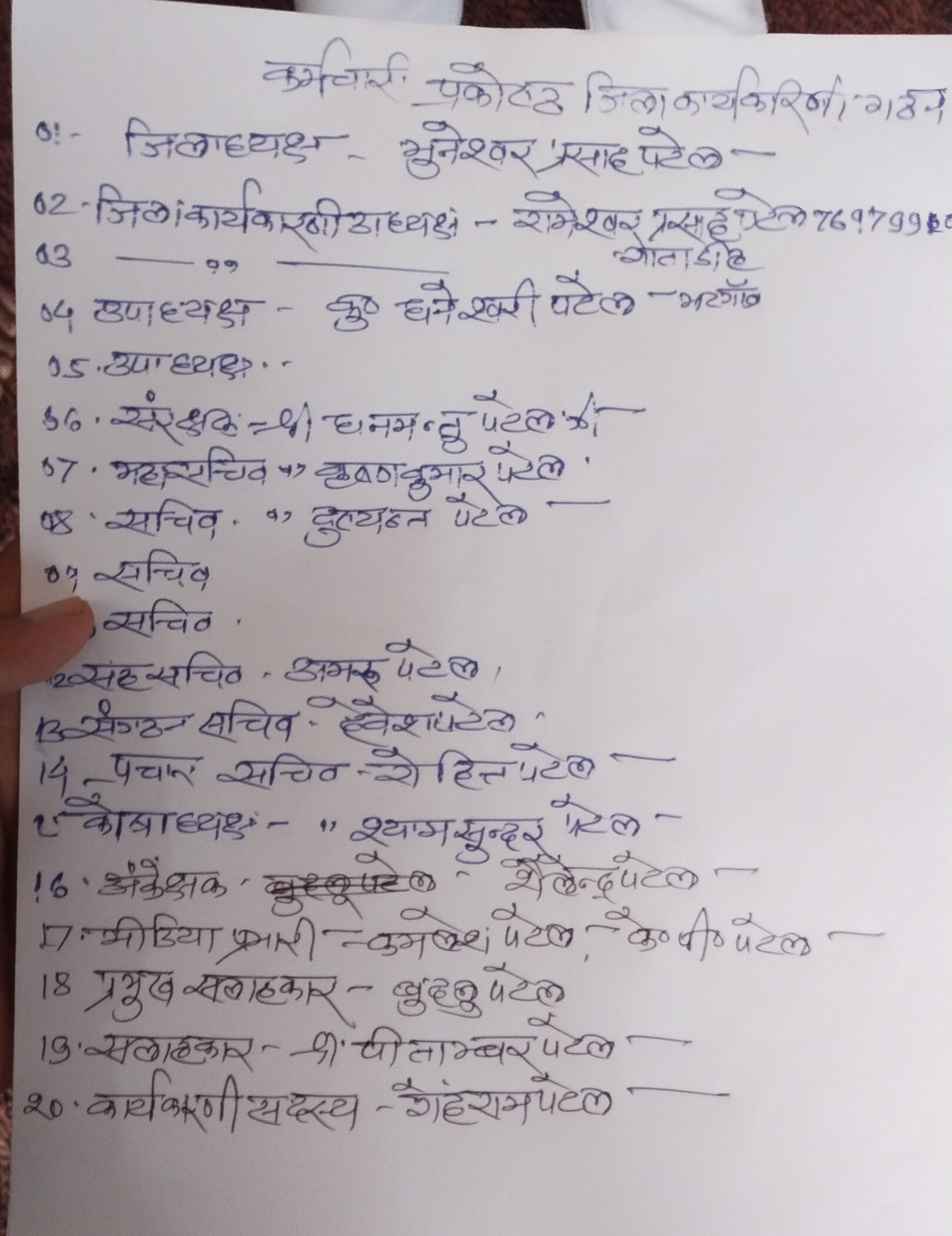 वहीं बैठक में सुरेन्द्र पटेल जी जिलाध्यक्ष – मरार महासंघ छत्तीसगढ़, भुनेश्वर प्रसाद पटेल जिलाध्यक्ष – कर्मचारी प्रकोष्ठ छत्तीसगढ़, प्राध्यापक सुश्री धनेश्वरी पटेल, पटवारी शैलेन्द्र पटेल, शिक्षक दुष्यंत पटेल, शिक्षक कृष्ण कुमार पटेल, शिक्षक रामेश्वर पटेल, शिक्षक गेंदराम पटेल, शिक्षक श्याम सुन्दर पटेल, शिक्षक रोहित पटेल, शिक्षक धनेश्वर पटेल, शिक्षिका श्रीमती सीमा पटेल, शिक्षिका श्रीमती सरस्वती पटेल, महाविद्यालय कर्मचारी कृष्णा कुमार पटेल, छात्रावास कर्मचारी अमरू पटेल व भुवनेश्वर पटेल, PWD के कर्मचारी कमलेश पटेल, रेडियोग्राफ़र देवश्वर पटेल, बहुददेशिय पुरुष कार्यकर्ता शिव शंकर पटेल, शिक्षक पुष्पेंद्र पटेल, नगर पंचायत कर्मचारी लक्मण पटेल, शा. कन्या शाला के कर्मचारी नरेंद्र पटेल, पुलिस कर्मचारी चंद्र शेखर पटेल, हेड मास्टर बिमल पटेल सहित पटेल युवा संघ के सदस्य के. पी. पटेल, बादल पटेल, किशन पटेल, रामप्रसाद पटेल, कुमार पटेल इत्यादि उपस्थित रहे.