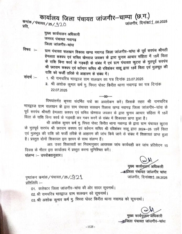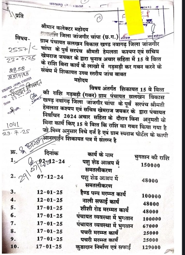 जांजगीर-चाम्पा। CG NEWS: पूर्व सरपंच एवं सचिव द्वारा विभिन्न कार्यों के नाम पर आचार संहिता के दौरान लाखों रुपए आहरण कर खेला किए है। उनके ऊपर शिकायतकर्ता ने अनियमितता के गंभीर आरोप लगाए है। कलेक्टर से शिकायत के बाद भी आज तक कोई कार्यवाही नहीं होने से सरपंच सचिव के हौसले बुलंद है। दरअसल मामला जनपद पंचायत नवागढ़ अंतर्गत ग्राम पंचायत सलखन का है। शिकायतकर्ता ने आरोप लगाया है कि पूर्व सरपंच ने ग्राम सचिव के साथ मिलकर अपने कार्यकाल में कई विकास कार्यों की पहलो किस्त की राशि आहरित कर ली, लेकिन कार्य को पूरा नहीं कराया। उनके कार्यालय ग्राम पंचायत सलखन
