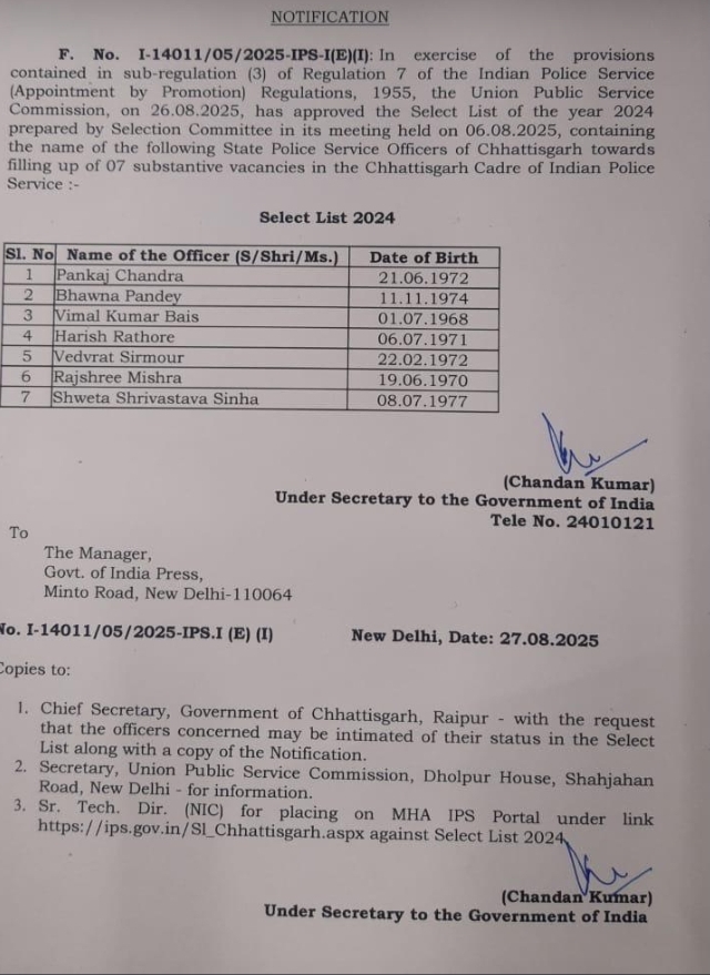 IPS PROMOTION BREAKING: छत्तीसगढ़ राज्य पुलिस सेवा के सात अधिकारी पदोन्नत होकर भारतीय पुलिस सेवा के अधिकारी हो गए हैं। इसके लिए दिल्ली में 6 अगस्त को डीपीसी हुई थी। इसमें सात अधिकारियों को आईपीएस अवार्ड के लिए हरी झंडी मिली थी। इसके बाद गृह मंत्रालय ने अधिसूचना जारी कर दी है।