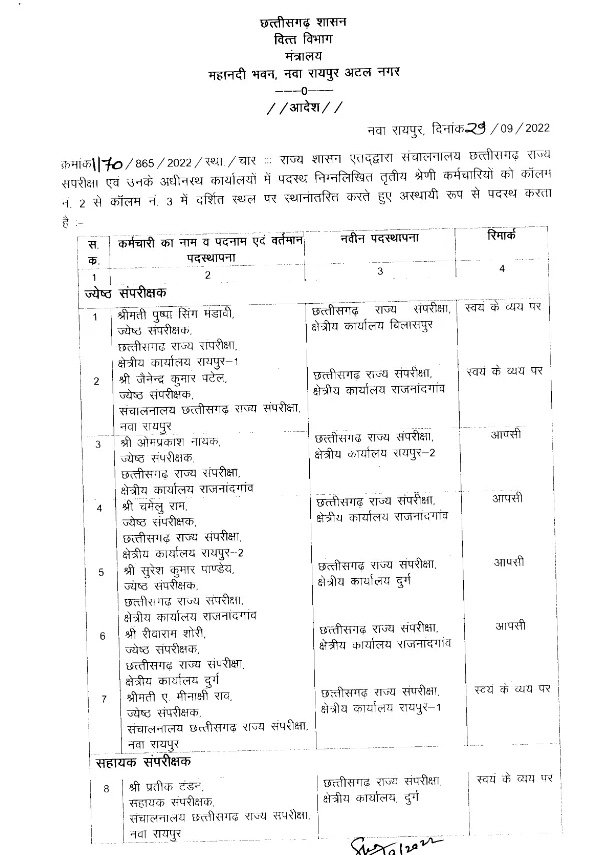 वित्त विभाग में बड़ी फेरबदल, ज्येष्ठ संपरीक्षक, सहायक संपरीक्षक सहित इन कर्मचारियों के हुए, देखें पूरी लिस्ट