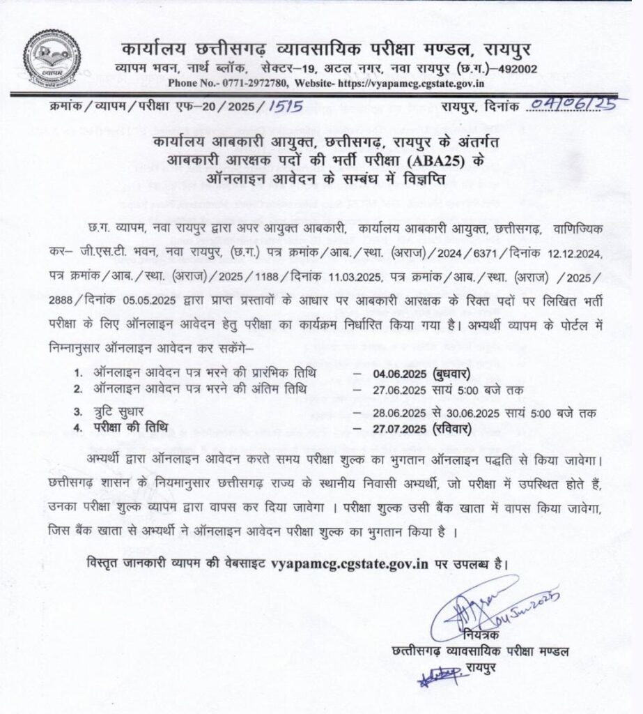 सारंगढ़ बिलाईगढ़, 23 जून 2025/छत्तीसगढ़ के आबकारी आयुक्त कार्यालय 200 आबकारी आरक्षक पदों के लिए भर्ती विज्ञापन जारी किया है, जिसका ऑनलाइन आवेदन छत्तीसगढ़ राज्य व्यावसायिक परीक्षा मंडल (व्यापम) की वेबसाइट में 27 जून 2025 को शाम 5 बजे तक आवेदन आमंत्रित किया है। आबकारी आरक्षक पद के लिए योग्यता बारहवीं उत्तीर्ण निर्धारित है।