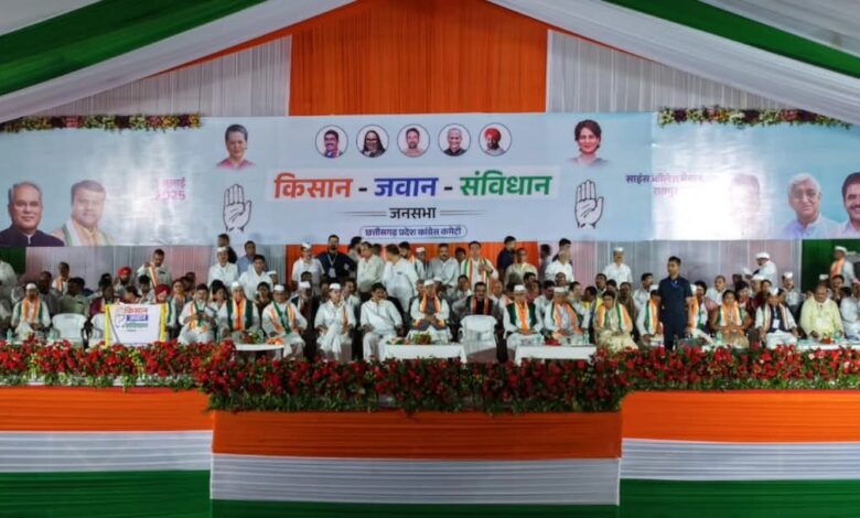 किसान, जवान,संविधान, जन सभा कार्यक्रम को दीपक बैज, ताम्रध्वज साहू, टी एस सिंहदेव, चरण दास महंत, भूपेश बघेल, सचिन पायलट, और अखिल भारतीय कांग्रेस कमेटी अध्यक्ष मल्लिकार्जुन खड़गे जी ने अपने ऊर्जावान उद्बोधन से संबोधित किया